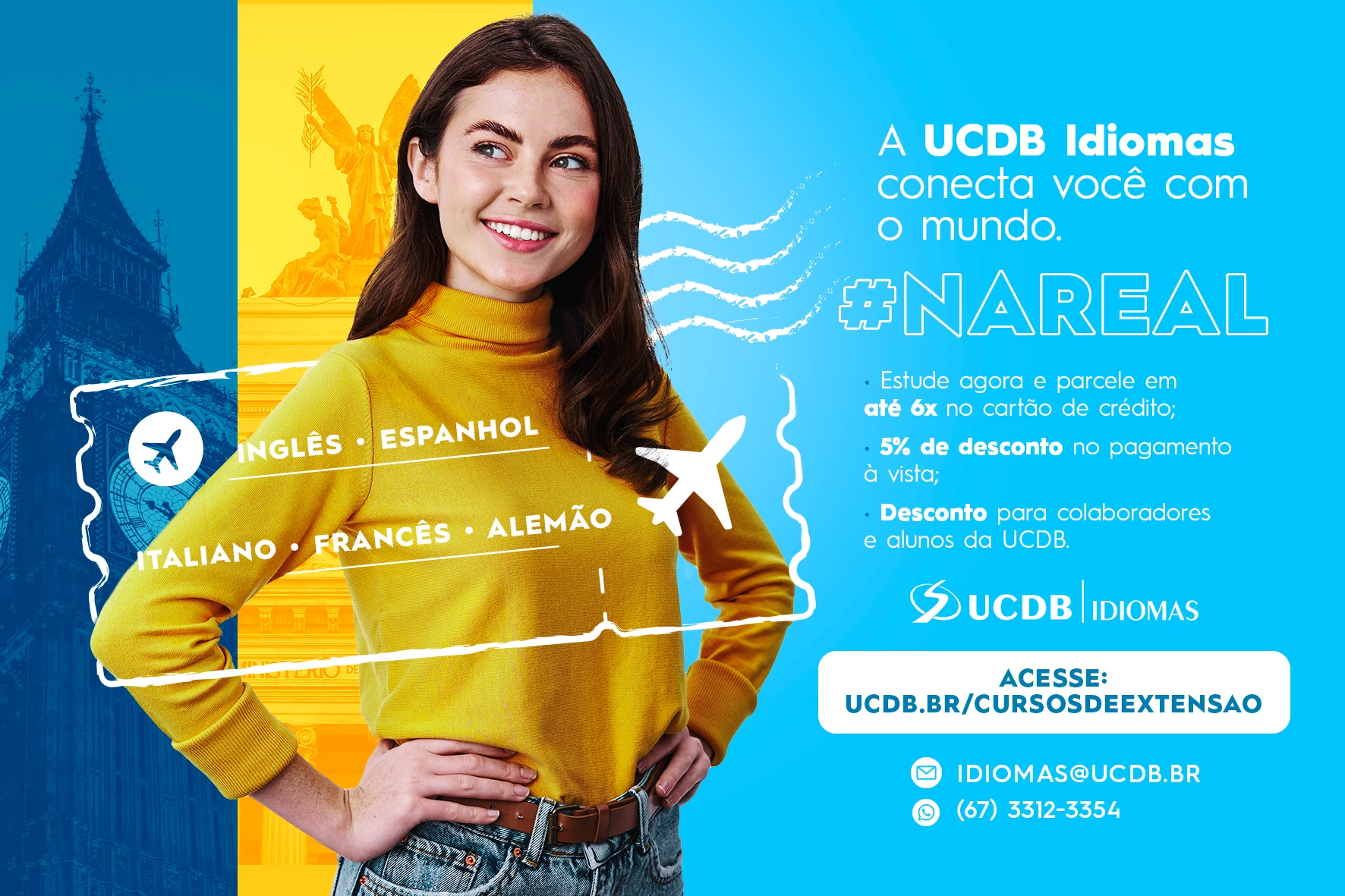 Lembrando que caso o aluno, de modo geral, já possua algum conhecimento do idioma escolhido, ele pode fazer a prova de nivelamento para saber qual estágio poderá iniciar o curso. O Programa UCDB Idiomas oferece cursos para o seu desenvolvimento profissional e crescimento pessoal. O investimento pode ser pago à vista com desconto de 5% ou dividido em seis parcelas no cartão de crédito. Colaboradores e filhos de colaboradores da Católica contam ainda com desconto especial. Mais informações no site ucdb.br/cursosdeextensao, via e-mail: idiomas@ucdb.br ou pelo telefone (67) 3312-3354 (whatsapp).