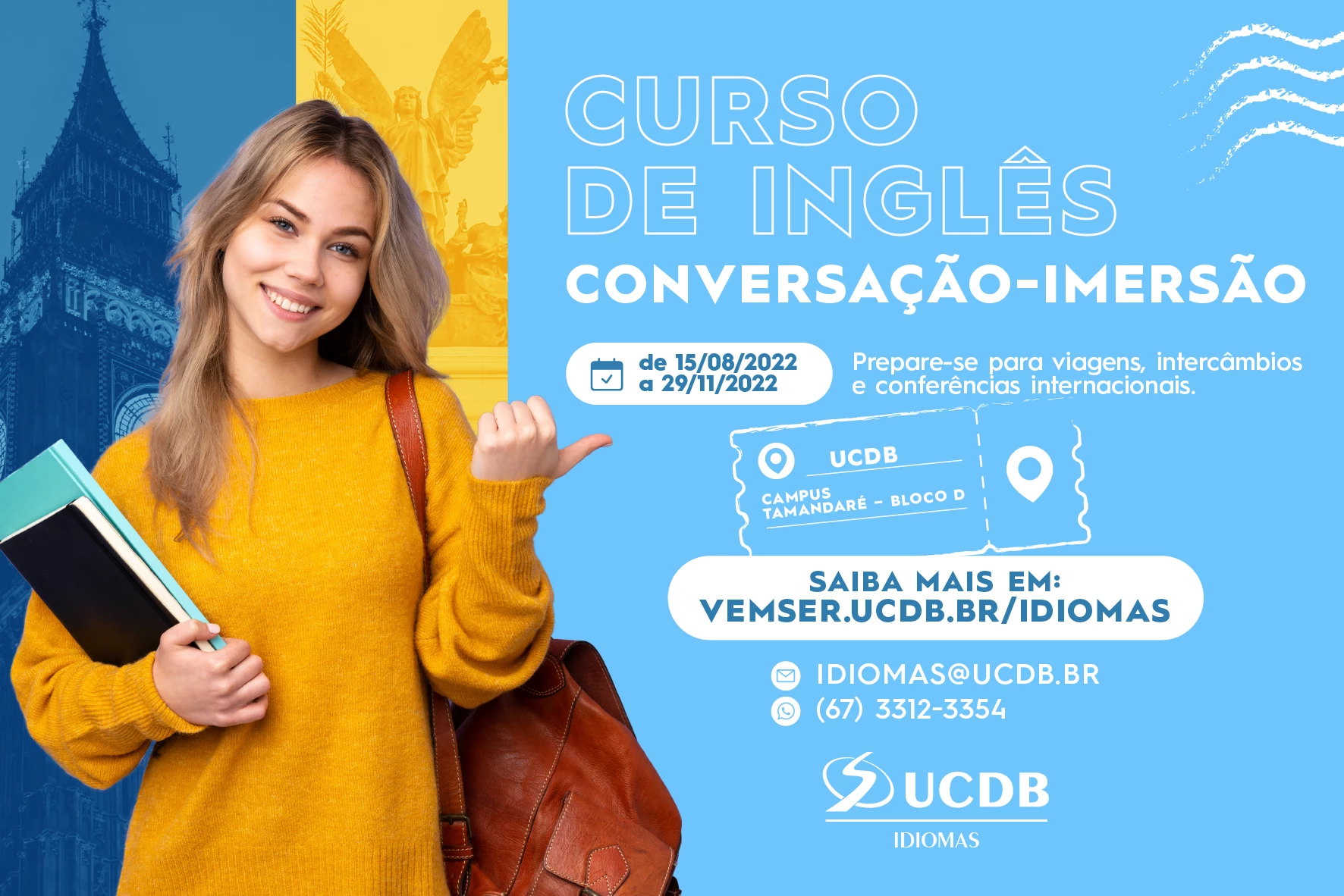 A UCDB Idiomas está com inscrições abertas para o curso específico de conversação em inglês para alunos com conhecimento intermediário do idioma. Inscrições podem ser feitas diretamente na sala da UCDB Idiomas, localizada no Pátio UCDB, ou pela internet, por meio do endereço vemser.ucdb.br/idiomas.