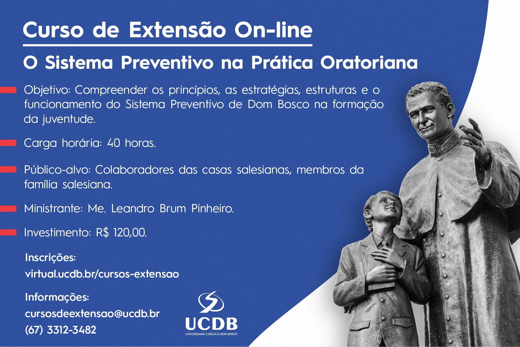 Com intuito de compreender os princípios, as estratégias, as estruturas e o funcionamento do sistema preventivo de Dom Bosco na formação da juventude é que a Universidade Católica Dom Bosco (UCDB) está com inscrições abertas para o curso de extensão on-line ‘Sistema preventivo na prática oratoriana’. As aulas serão realizadas a partir de maio deste ano, sendo ministradas pelo Pe. Leandro Brum Pinheiro.