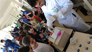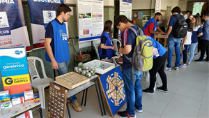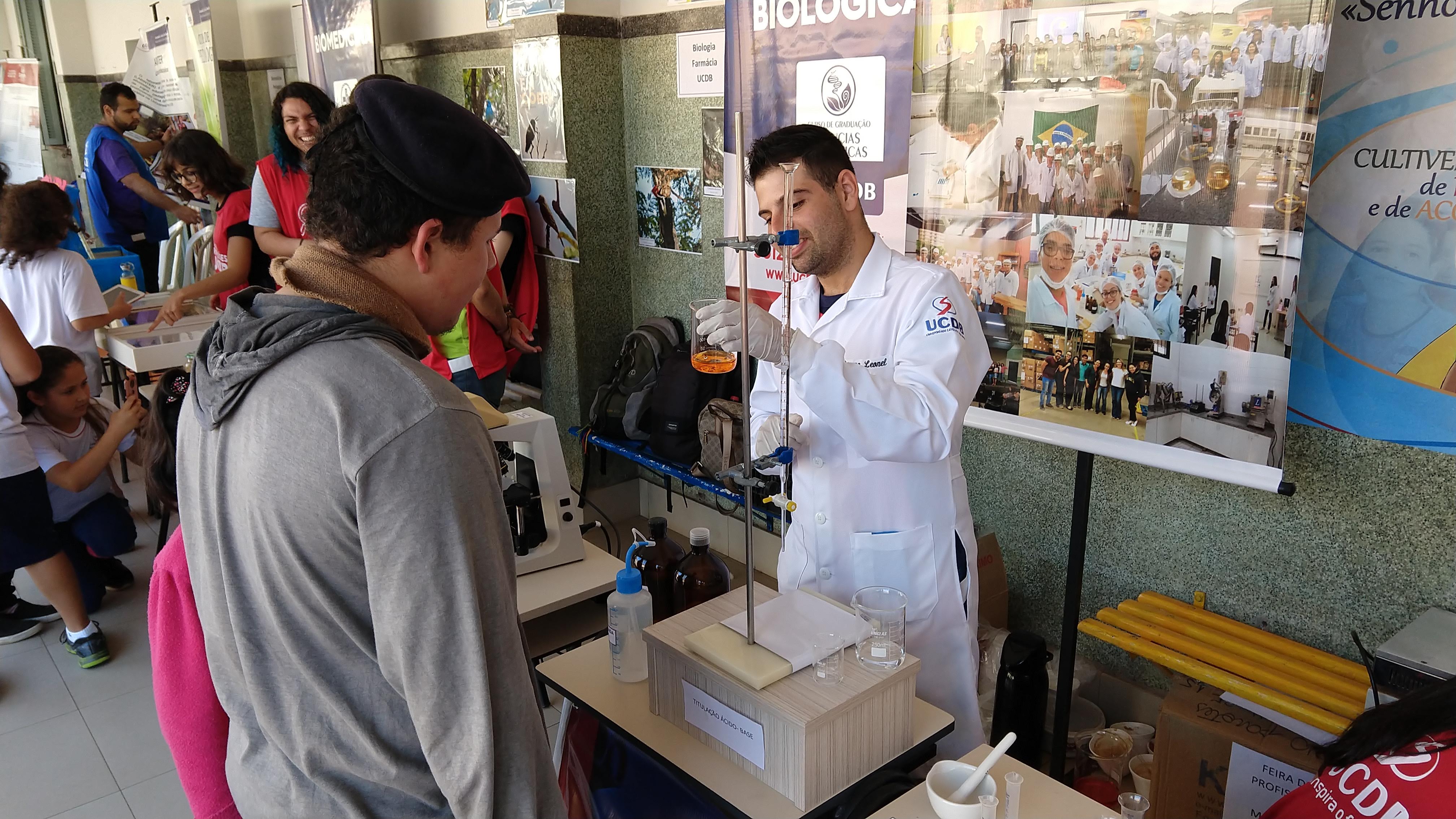 Uma amostra do laboratório de Farmácia da UCDB foi montada para que os alunos pudessem verificar uma parte do trabalho elaborado. “O aluno pode conhecer um pouquinho sobre o que se desenvolve no laboratório, as ocorrências de reações químicas, informações sobre o uso de medicamentos, sobre a dosagem de medicamentos, sobre o uso de plantas medicinais”, explicou a coordenadora do curso de Farmácia, Marla Riberio Arima.