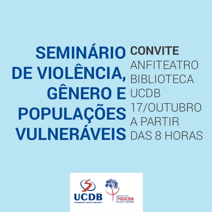 O Programa de Pós-graduação em Psicologia — Mestrado e Doutorado da Universidade Católica Dom Bosco (UCDB) realiza no dia 17 o primeiro 'Seminário de Violência, Gênero e Populações Vulneráveis'. O evento tem o objetivo de proporcionar discussões a respeito do tema e apresentar pesquisas desenvolvidas pelos acadêmicos. Estão previstas duas mesas-redondas com a participação de doutorandos e docentes da Católica e convidados.