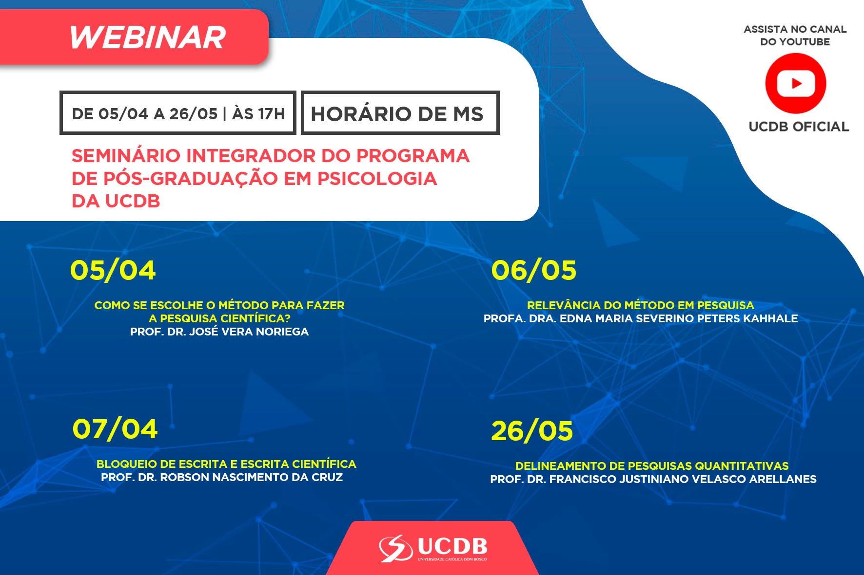 Ontem (5), foi realizada a palestra ‘Como se Escolhe o Método para Fazer a Pesquisa Científica?’, ministrada pelo professor Dr. José Vera Noriega. Amanhã (07), às 17h, no canal do Youtube da UCDB, será a vez da palestra ‘Bloqueio de Escrita e Escrita Científica’, com o professor Dr. Robson Nascimento da Cruz.