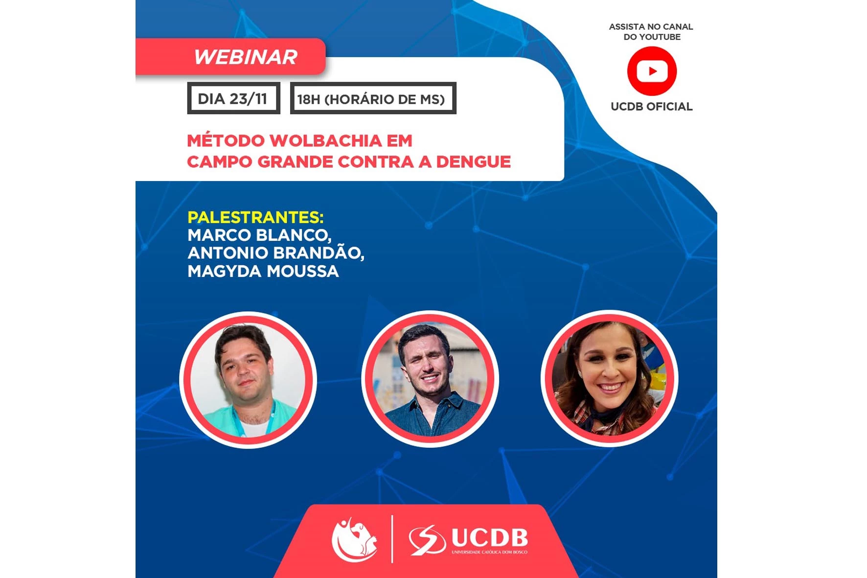 Nesta quarta-feira (23), a comunidade educativa da Universidade Católica Dom Bosco pode acompanhar, no canal da UCDB no Youtube, a webinar “Método Wolbachia em Campo Grande contra a dengue” e entender mais como funciona o projeto que vem tendo bons resultados contra a proliferação da doença que infecta tantas pessoas, todos os anos, e leva à morte. A transmissão on-line começa às 18h e é um serviço de utilidade pública para a população.