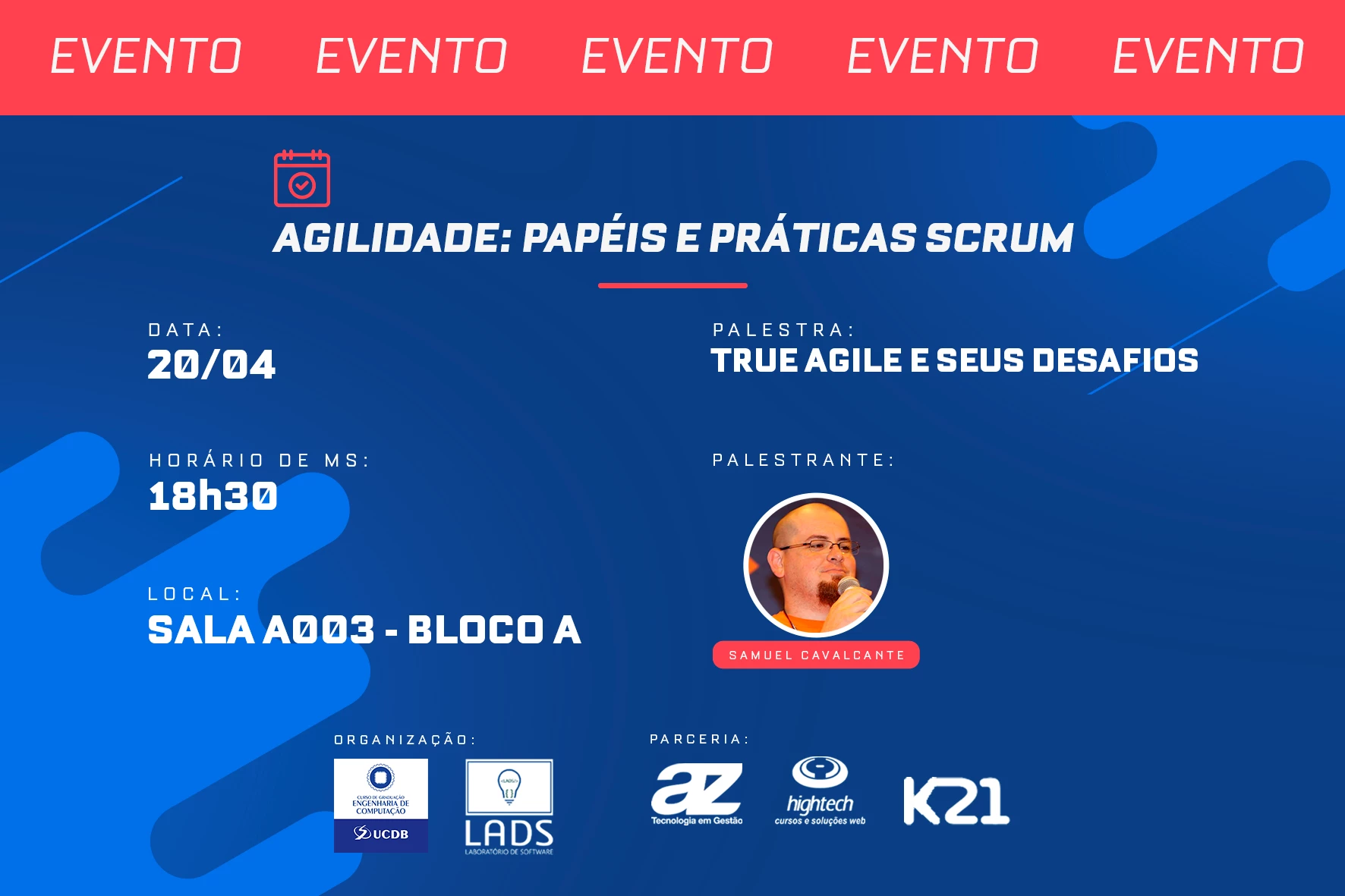 A Universidade Católica Dom Bosco (UCDB), por meio do curso de Engenharia da Computação com o projeto de extensão Laboratório de Desenvolvimento de Software (Lads) realiza nesta quarta-feira (20), às 18h30, na sala A003 do bloco A, a palestra ‘A verdade sobre agilidade e seus desafios’, ministrada pelo professor da Católica, Samuel Cavalcante, Agile Expert, Trainer and Partner at K21.