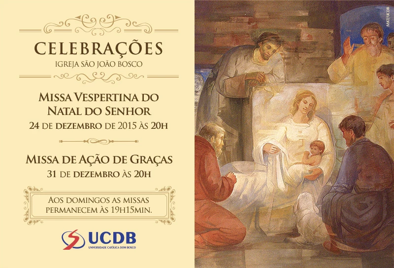 A Universidade Católica Dom Bosco (UCDB) realiza nesta quinta-feira (31), a partir das 20 horas, Missa em Ação de Graças na Igreja São João Bosco, localizada entre os blocos A e C da Instituição. A celebração é destinada a comunidade em geral, sendo a entrada para o estacionamento (gratuito) pelo bloco A.