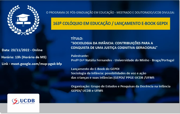 O Programa de Pós-Graduação, Mestrado e Doutorado em Educação da Universidade Católica Dom Bosco (UCDB) realiza nesta quarta-feira (23), às 13 horas, de forma on-line pelo Google Meet, a 163ª edição do Colóquio em Educação, e o lançamento de um e-book do grupo de pesquisa, coordenado pela professora Dra. Marta Regina Brostolin.