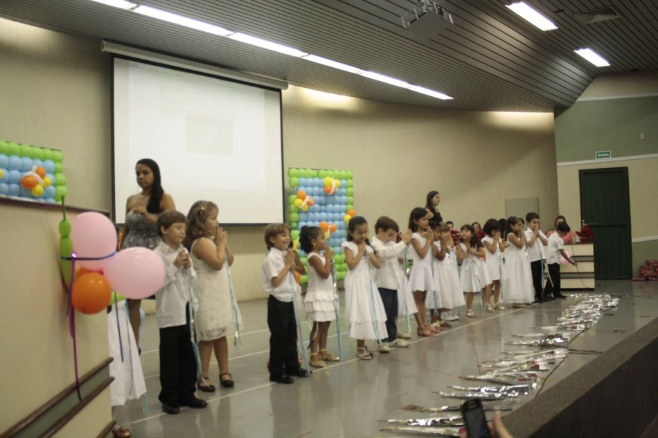 Pais, familiares e amigos assistiram a três apresentações dos formandos, duas músicas e um poema. A cada apresentação, os pequenos encantavam com um figurino diferente, e no final como forma de agradecimento entregaram rosas ao seus pais. A cerimônia também contou com entrega de diplomas.