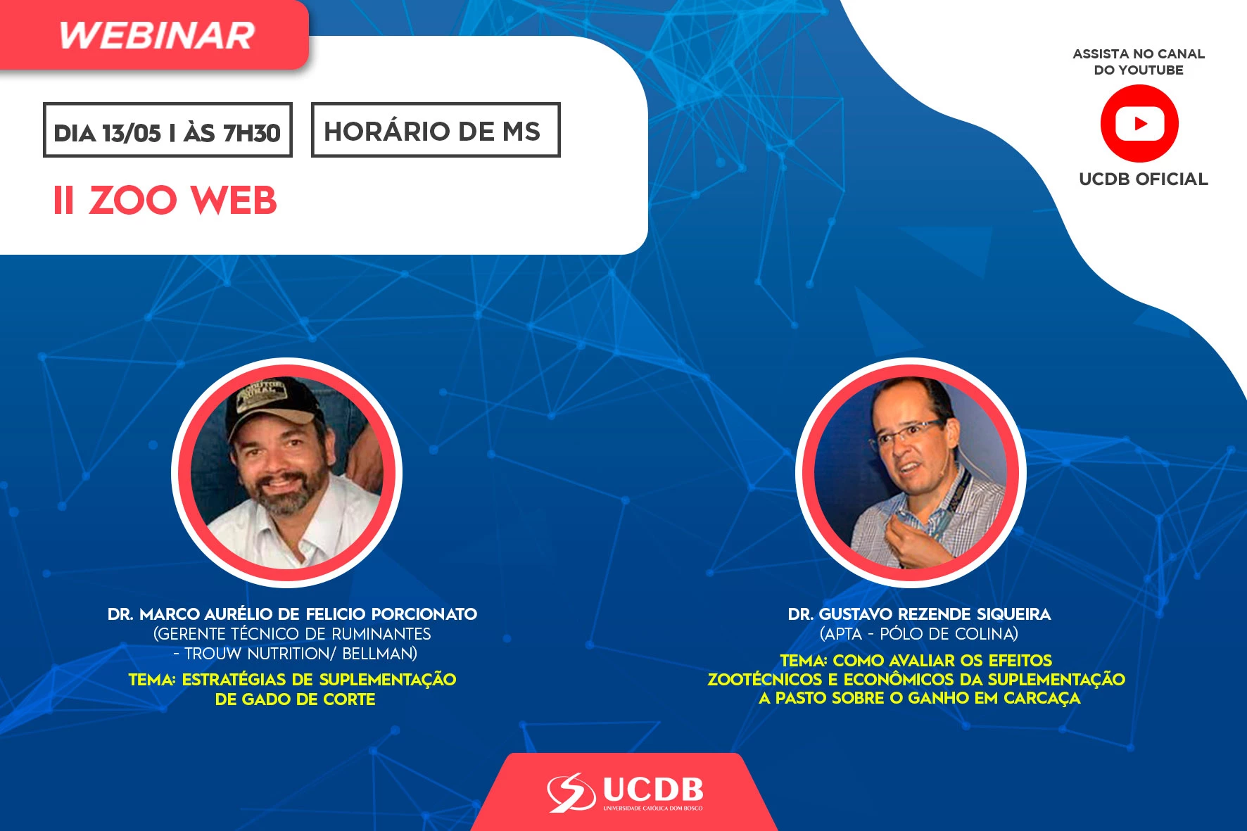 A Universidade Católica Dom Bosco (UCDB), por meio do curso de Zootecnia, realiza na próxima quinta-feira (13), às 7h30, com transmissão pelo Youtube oficial da Católica, a segunda edição do Zoo Web, com as palestras “Estratégias de Suplementação de Gado de Corte” e “Como Avaliar os Efeitos Zootécnicos e Econômicos da Suplementação a Pasto sobre o Ganho em Carcaça”.