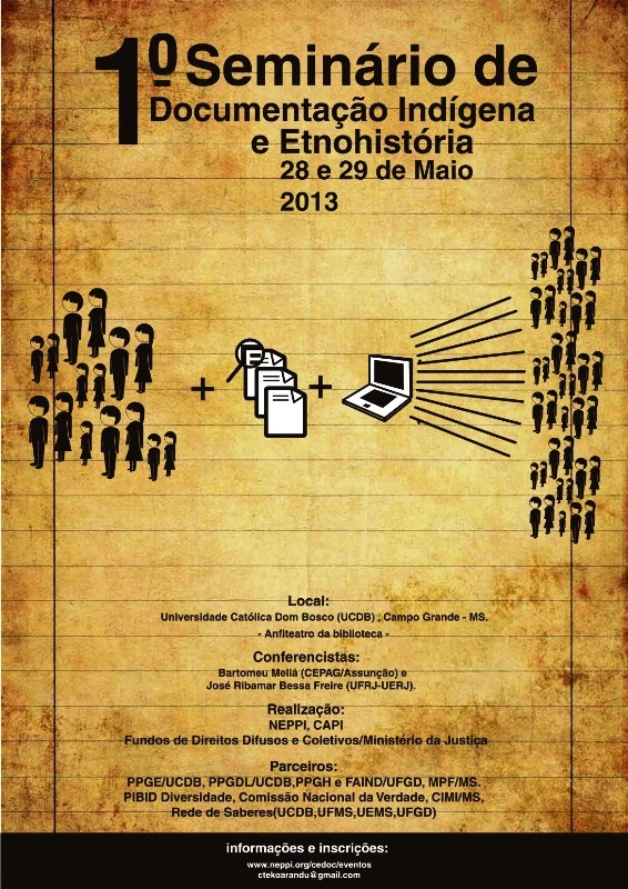 Entre os dias 28 e 29 de maio, será realizado no anfiteatro da Biblioteca Pe. Félix Zavattaro, na Universidade Católica Dom Bosco (UCDB), o I Seminário de Documentação Indígena e Etnohistória. Durante o evento serão realizadas conferências com Bartomeu Meliá (CEPAG/Assunção) e José Ribamar Bessa Freire (UFRJ-UERJ).