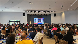 Três palestrantes se apresentaram: Luciane Abramo, Marcelo Pirani e Karim Khoury, que abordaram liderança, gestão de equipes e inovação.