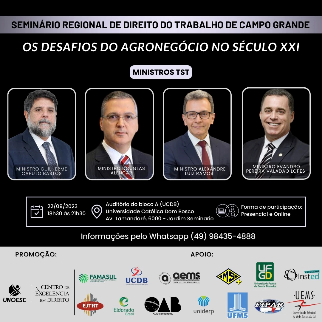 A Universidade Católica Dom Bosco (UCDB) vai sediar o “Seminário Regional de Direito do Trabalho de Campo Grande - Os desafios do agronegócio no século XXI”. O evento ocorre de forma híbrida na próxima sexta-feira (22), a partir das 18h30, no auditório do bloco A, da Católica. As inscrições podem ser feitas pela internet e acadêmicos têm desconto de 80%.