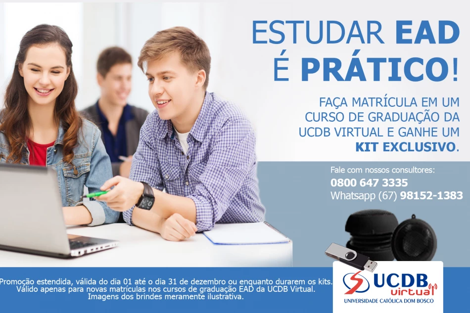 UCDB Virtual, da Universidade Católica Dom Bosco (UCDB), está com uma promoção durante todo o mês de dezembro. Os alunos que se matricularem em qualquer curso de graduação EAD ganham um kit UCDB Virtual, contendo um pen drive e uma caixa de som. A promoção vale até o dia 31 de dezembro ou enquanto os kits durarem. As matrículas podem ser realizadas por meio dos consultores pelo número 0800 647 3335 ou pelo whatsapp (67) 98152-1383.