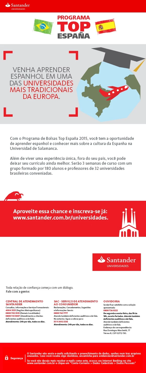 Neste ano, serão 180 bolsistas beneficiados de 32 universidades brasileiras. O Programa Top España ocorre durante três semanas, nas quais o aluno beneficiado participa de um Curso de Idioma e Cultura Espanhola na Universidad de Salamanca, na Espanha, com toda a estrutura inclusa, desde traslados, alimentação, hospedagem, até curso e certificado. A viagem tem a data programada de 29 de junho a 23 de julho.