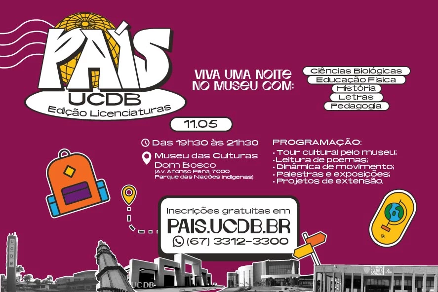 Para conhecer um pouco mais sobre o universo dos cursos de Licenciaturas (Letras, Pedagogia, Ciências Biológicas, Educação Física e História), a Universidade Católica Dom Bosco prepara um evento especial no Museu das Culturas Dom Bosco no dia 11 de maio, a partir das 19h30, em mais uma edição do País UCDB.