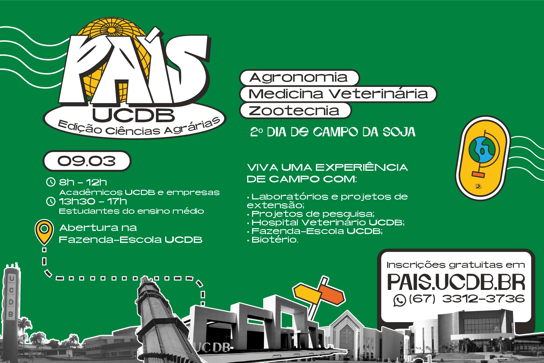A Universidade Católica Dom Bosco realiza no dia 9 de março, a partir das 8 horas, a edição Ciências Agrárias do País UCDB, um evento que vai envolver profissionais de Agronomia, Medicina Veterinária e Zootecnia, empreendedores, acadêmicos e estudantes do ensino médio proporcionando uma experiência de campo com laboratórios, projetos de extensão e de pesquisa. A ação ocorrerá na Fazenda-Escola UCDB, localizada no Instituto Salesiano São Vicente. As inscrições são gratuitas e podem ser feitas pela internet através do endereço pais.ucdb.br.