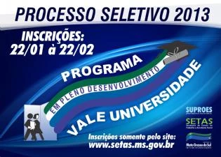 Começa hoje o prazo de inscrições para o processo seletivo 2013 do Programa Vale Universidade. O procedimento deverá ser realizado somente pelo site www.setas.ms.gov.br no prazo de um mês. Após o período de inscrição será realizada a classificação preliminar dos candidatos e os nomes dos pré-selecionados serão divulgados na internet. O programa é executado e monitorado pela Superintendência de Projetos Especiais (Suproes), que é vinculada à Secretaria de Estado de Trabalho e Assistência Social (Setas), com o objetivo de capacitar acadêmicos para serem profissionais diferenciados em seus campos de atuação.