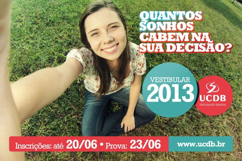 Hoje é o último dia de inscrições para o Vestibular UCDB 2013B, que devem ser feitas pelo site www.ucdb.br. São oferecidas vagas em cursos presenciais e a distância, pela UCDB Virtual. pelo site www.ucdb.br. As provas serão aplicadas no dia 23, a partir das 8h, no campus da Avenida Tamandaré.