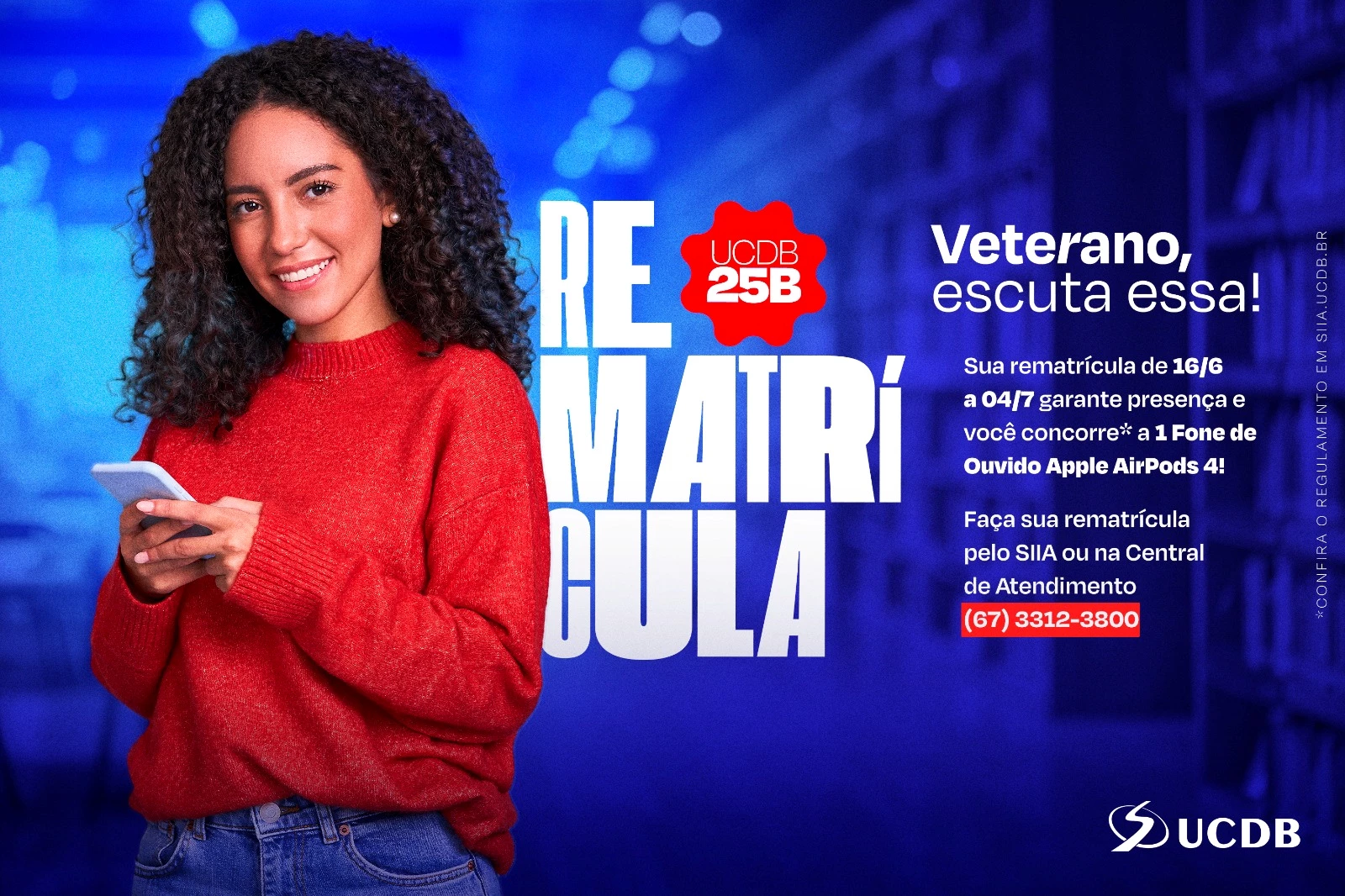 Acadêmicos veteranos da Universidade Católica Dom Bosco (UCDB) que anteciparem a rematrícula 2025B, concorrem a um AirPods 4. Terão direito à participação do sorteio todos os alunos veteranos, dos cursos de graduação presencial e também do ensino à distância, que realizarem a rematrícula até o dia 4 de julho deste ano.