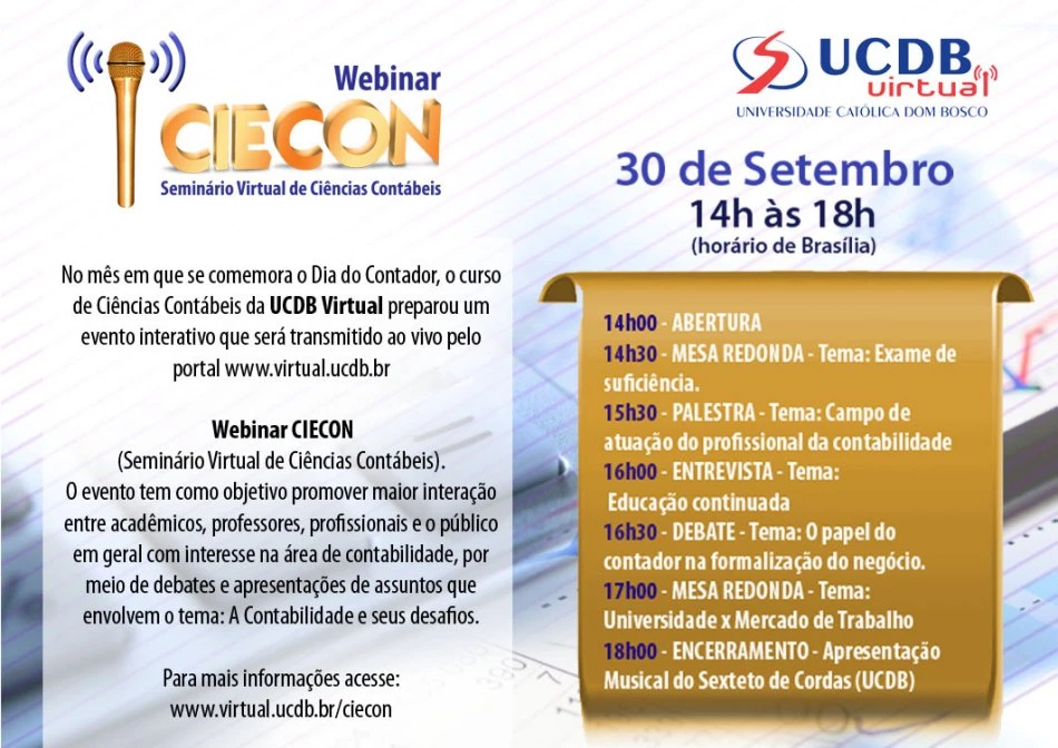 O curso de Ciências Contábeis da UCDB Virtual realiza na próxima segunda-feira (30) a primeira edição do Seminário Virtual de Ciências Contábeis (Webinar CIECON), evento criado pelo grupo de docentes da UCDB Virtual em comemoração ao Dia do Contador, comemorado no dia 22 de setembro.