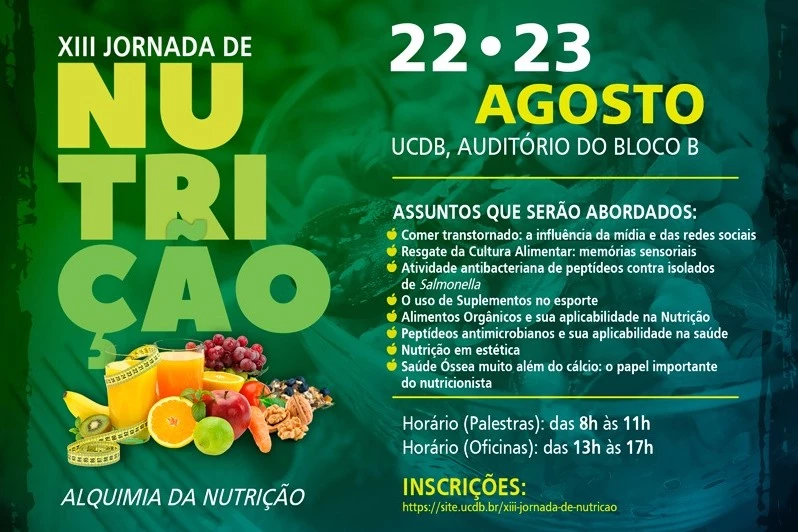 “Resgate da Cultura Alimentar: Memórias Sensoriais”, “Comer Transtornado: a Influência da Mídia e das Redes Sociais”, “Alimentos Orgânicos e sua Aplicabilidade na Nutrição” e “Nutrição em Estética” serão alguns dos assuntos discutidos durante a XIII Jornada de Nutrição promovida pela Universidade Católica Dom Bosco (UCDB) nos dias 22 e 23 deste mês.