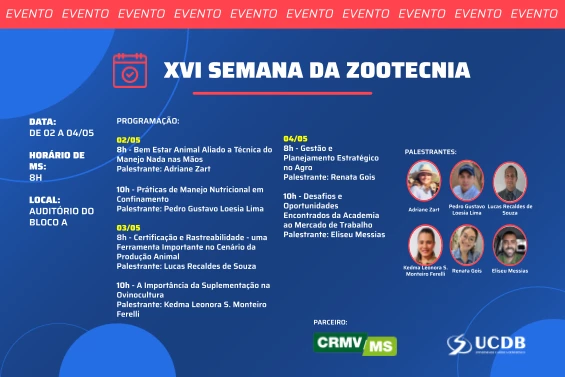 A tradicional Semana de Zootecnia da UCDB traz, nesta 16ª edição, discussões para acadêmicos, produtores rurais, pesquisadores e docentes. Estão previstas seis palestras, de hoje (2) a quinta-feira (4), sempre no auditório do bloco A, no período matutino, com o objetivo de oferecer atualização, vivência de experiências e novos conhecimento, bem como fomentar a criação e manejo de animais nas cadeias produtivas pecuárias.