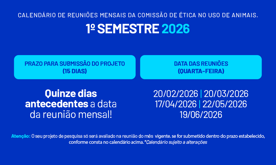 Os Protocolos que atenderem todas as exigências das Resoluções vigentes, seguem para avaliação ética da Comissão em reunião agendada. O prazo para emissão de parecer consubstanciado ou Certificado são de até 30 dias úteis, após a avaliação dos membros. A CEUA/UCDB realiza as reuniões mensais, conforme calendário prévio a seguir: