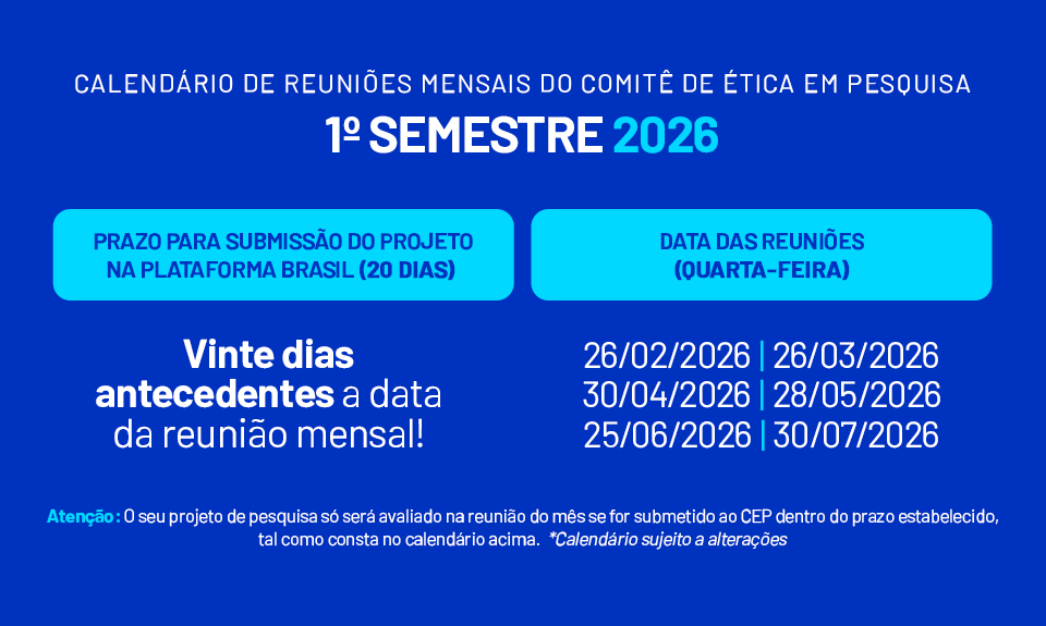 O prazo para emissão de parecer consubstanciado é de até 30 dias úteis após a validação documental. O CEP/UCDB realiza reuniões mensais, conforme calendário a seguir:
