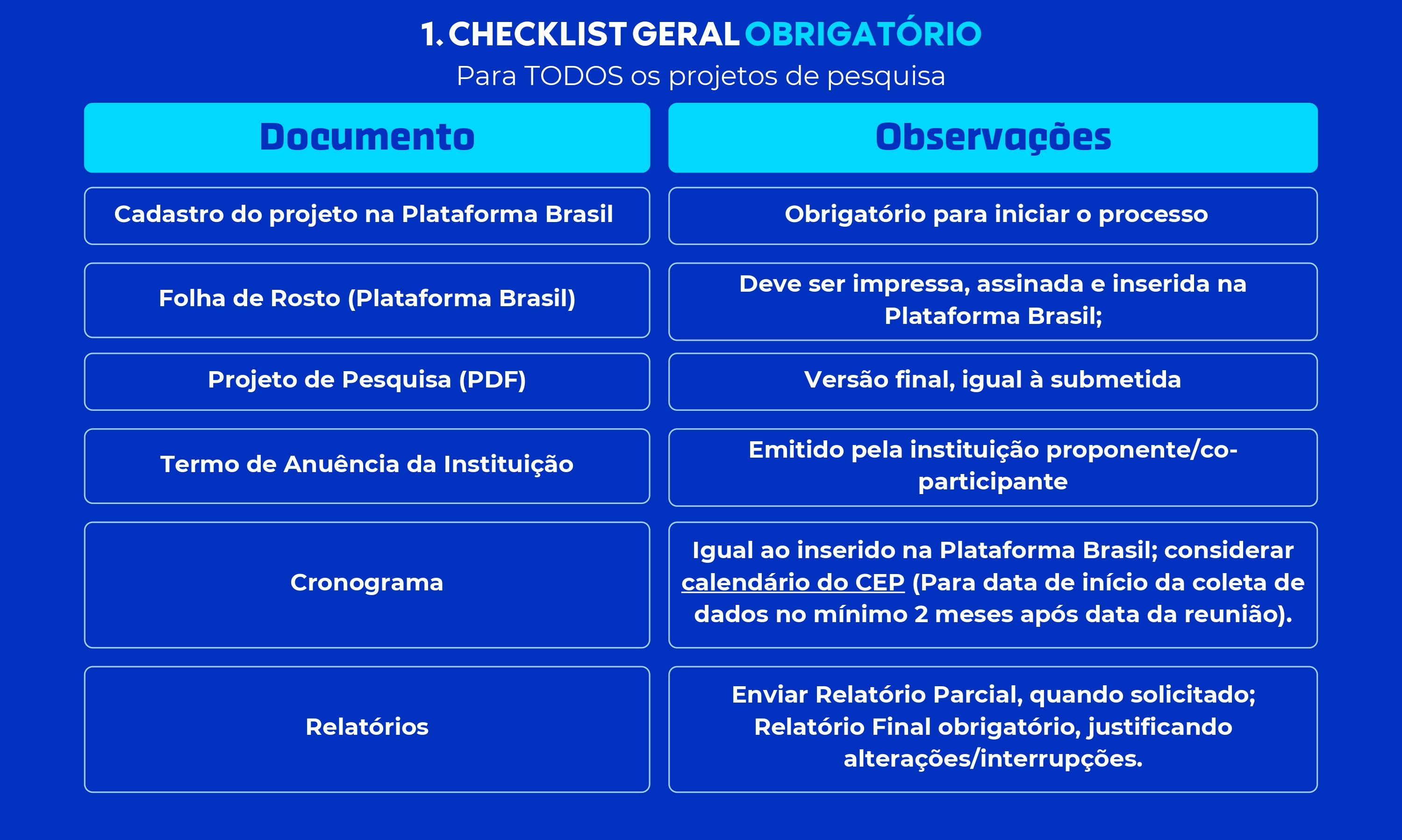 Além do Folha de Rosto (Plataforma Brasil), Projeto de Pesquisa (PDF), Termo de Anuência da Instituição, Termo de Compromisso do Pesquisador Responsável e Cronograma, consulte a lista por tipo de pesquisa de documentos obrigatórios na seção “Documentos para Submissão” desta página.
