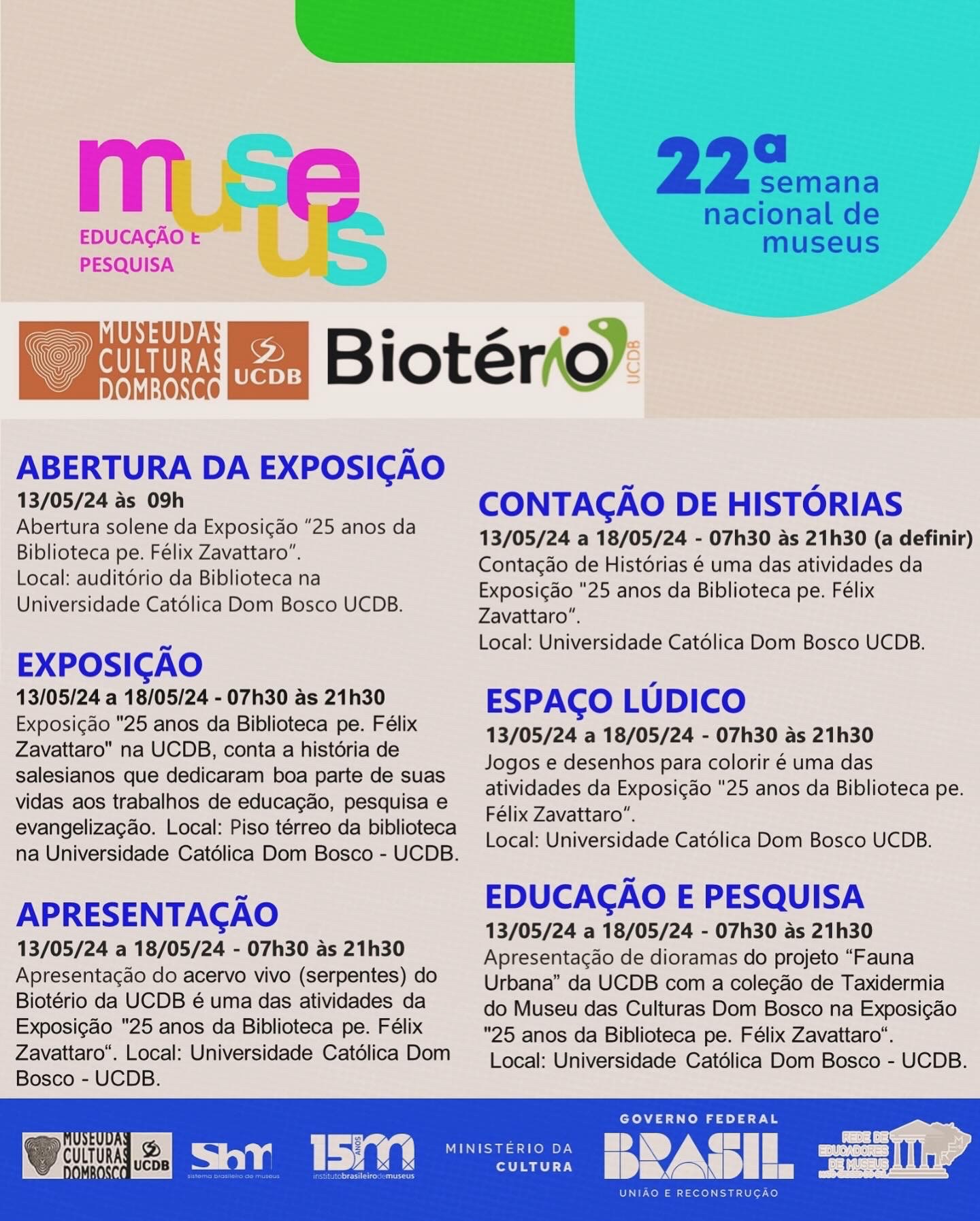 As comemorações também contarão com a presença do Biotério da UCDB, que levará algumas serpentes para exposição ao público. Também serão disponibilizados espaços lúdicos para contação de histórias, jogos, entre outros. A exposição permanecerá aberta ao público até o dia 18 de maio, das 7h30 às 21h30.