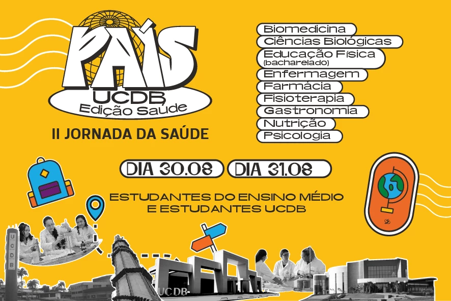 A Universidade Católica Dom Bosco está com inscrições abertas para a edição Saúde do País UCDB, evento voltado para estudantes do ensino médio de escolas públicas e privadas de Campo Grande e do interior de Mato Grosso do Sul. O evento ocorre no dia 30, das 13h às 17h30, e serão oferecidas experiências práticas e informações sobre os cursos de Biomedicina, Ciências Biológicas, Educação Física, Enfermagem, Farmácia, Fisioterapia, Gastronomia, Nutrição e Psicologia.